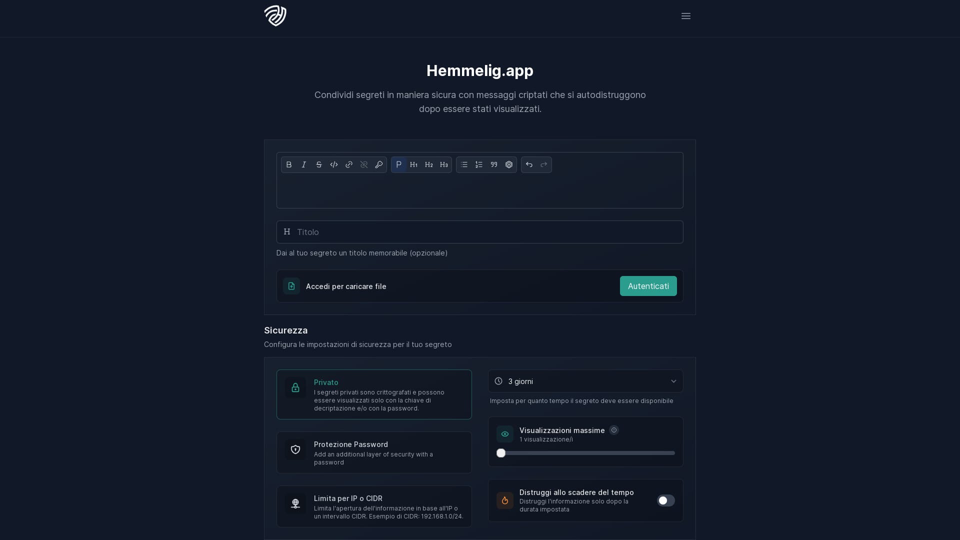 Applicazione per condividere note o dati importanti (password, PIN, ecc) in modo sicuro. Condividi un link che si auto-distrugge dopo la prima lettura, o dopo tot giorni. Per questo motivo, le statistiche non le abbiamo configurate, altrimenti avremmo registrato i link di tutte le note generate dagli utenti.
